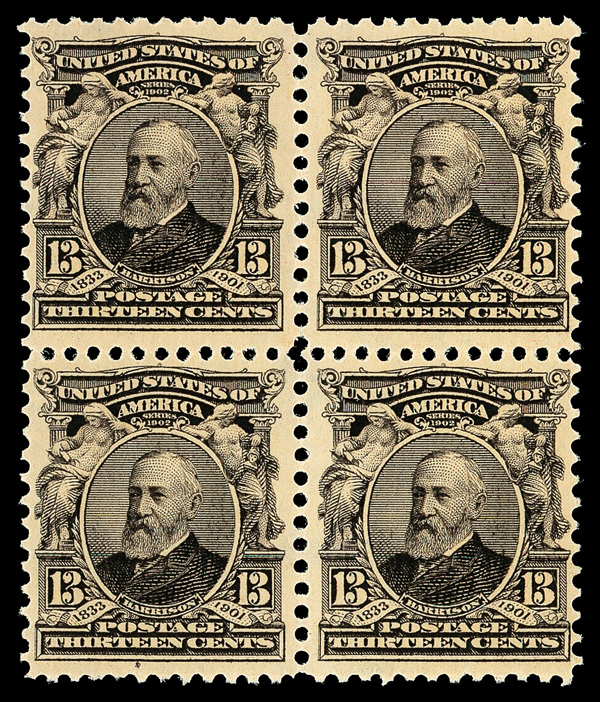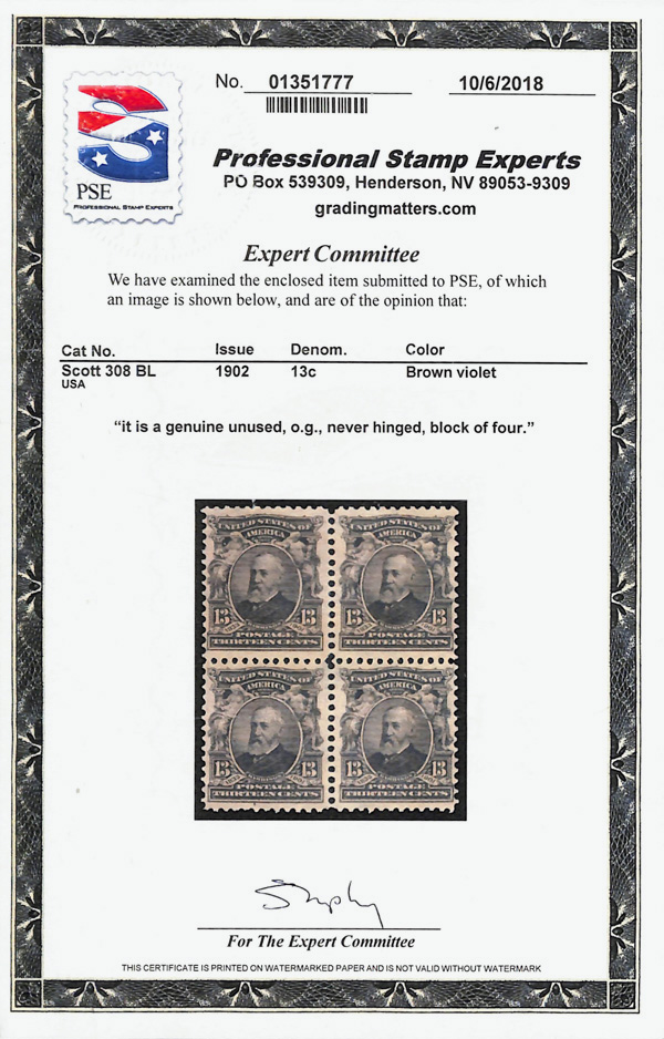 7042 nhbl 308 image1902, 13¢ purple black (Scott 308), block of 4, o.g., never hinged, clean and nicely centered, Fine, with 2018 P.S.E. certificate.