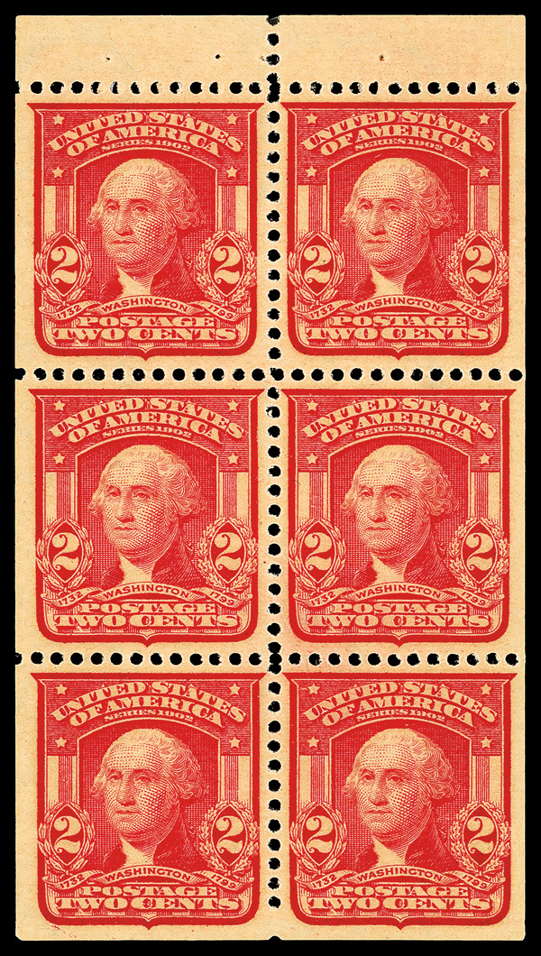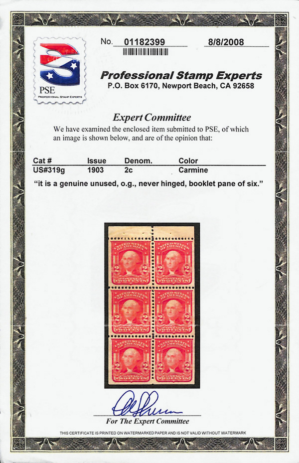 7043 BKnh 319g image1903, 2¢ carmine, type I, booklet pane of 6 (Scott 319g), exquisite as-issued look, o.g., never hinged, Fine to Very Fine, with 2008 P.S.E. certificate.