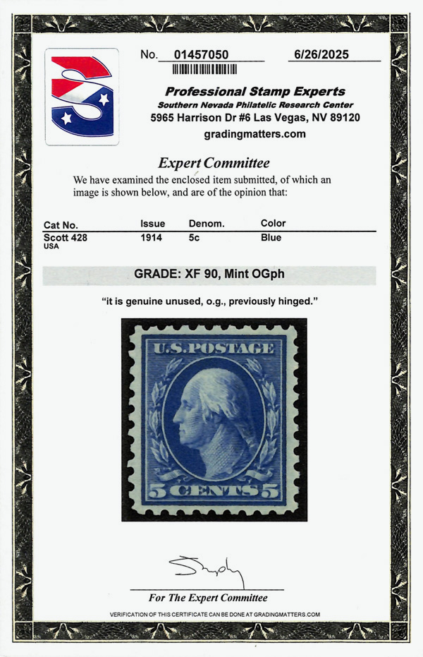 7071 og 428 image1914, 5¢ blue, S.L. watermark, perf. 10 (Scott 428), Newly minted appearance, o.g., previously hinged, Extremely Fine, with 2025 P.S.E. certificate graded XF 90.