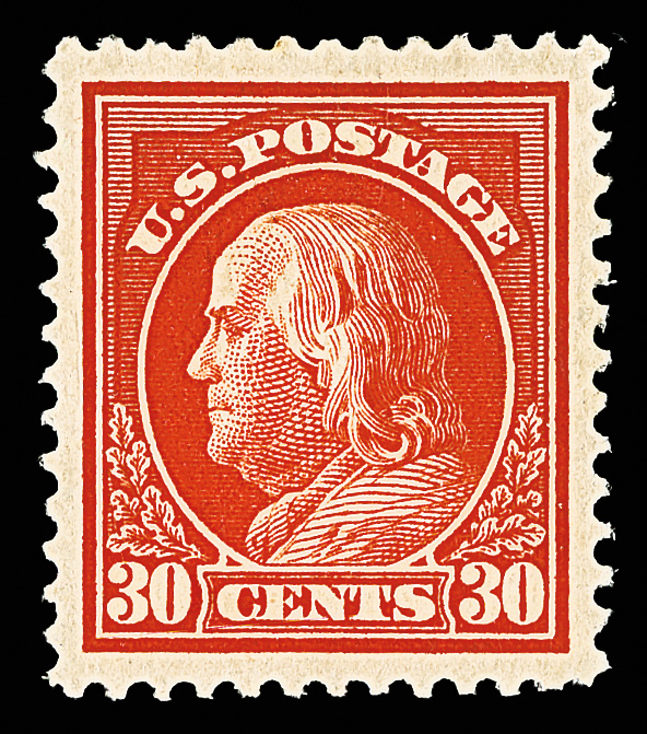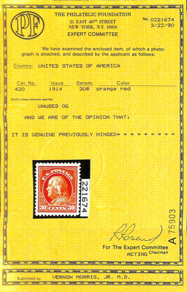 7068 og 420 image1914, 30¢ orange red, S.L. watermark, perf. 12 (Scott 420), o.g., very lightly hinged, pristine with immense color depth and exceptional centering; a pretty stamp, Extremely Fine, with 1990 P.F. certificate.