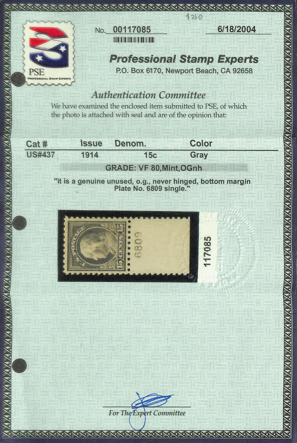 7072 nh 437 image1914, 15¢ gray, S.L. watermark, perf. 10 (Scott 437), o.g., never hinged, fresh with bright color and clear margins all around, Very Fine, with 2004 P.S.E. certificate graded VF 80 (as bottom margin plate number single, selvage since removed but included).