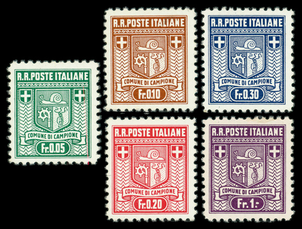 7798 nh 1B-5B image1944, Campione d'Italia .05fr-1fr, complete set of single, These stamps were only sold and valid for use within this municipality of Campione and to Italy., o.g., never hinged, Fine to Very Fine.