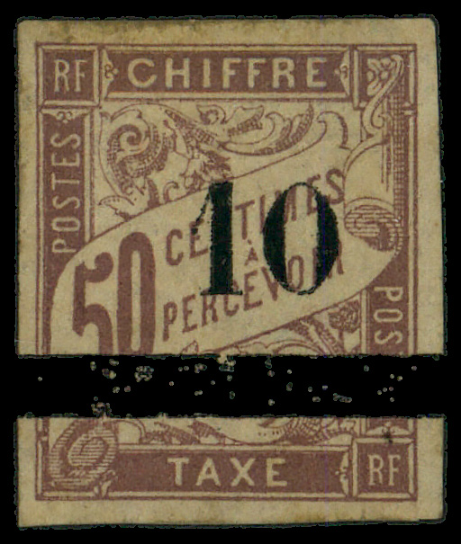7931 og J1 image1903, french Colonies 50c lilac surcharged 10c in black with bar (Scott J1), single, o.g., hinged, Fine to Very Fine.