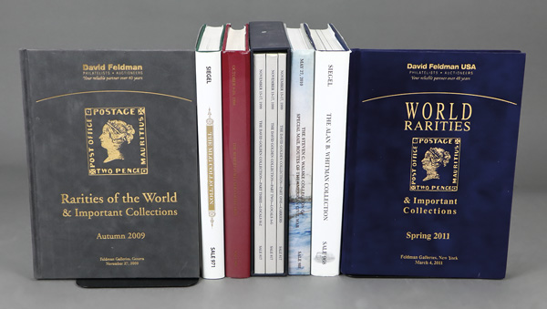7991 rarities and named sales imageVaried, World rarities and named auctions, two David Feldman and five Robert A Siegel hardcover auction catalogs; Feldman Autumn 2009 Rarities of the World and Spring 2011; Siegel Sale 968 (Alan B Whitman Outstanding United States Stamps), Sale 988 (Steven C Walske Special Mail Routes of the American Civil War), Sale 817 (David Golden Carriers and Locals 3 vol in boxed set), Sale 804 (Robert Zoellner United States Postage Stamps), and Sale 971 (MLG United States Plate Blocks); mouth watering. Shipping charges apply - weight 29 lbs. (Image) Suggested Bid $12