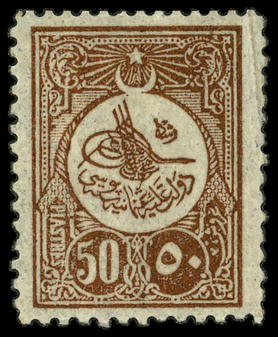 7980 og 160 image1909, Tughra "Reshad" of Sultan Mohammed V 50pi red brown (Scott 160), single, o.g., hinged, Fine to Very Fine.