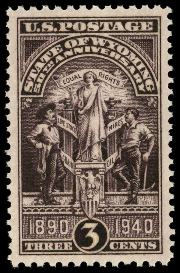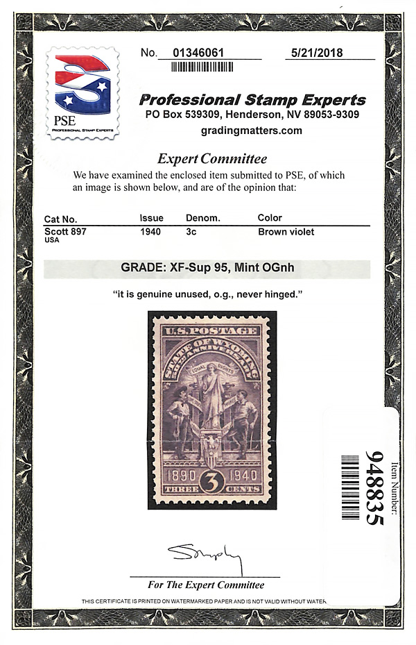 7154 nh 897 image1940, 3¢ Wyoming Statehood (Scott 897), o.g., never hinged, Extremely Fine to Superb, with 2018 P.S.E. certificate graded XF-SUP 95.