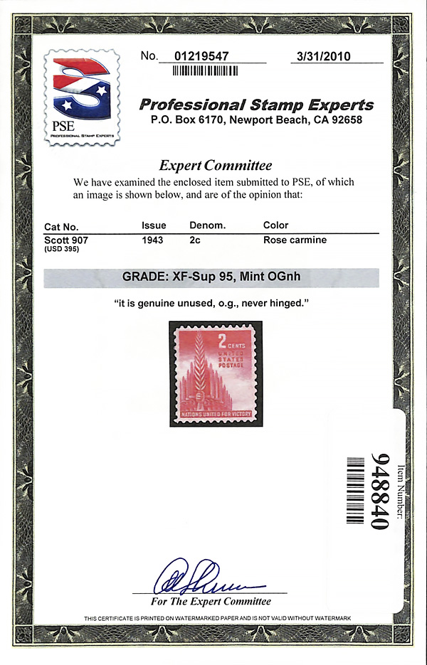 7156 nh 907 image1943, 2¢ Allied Nations (Scott 907), o.g., never hinged, Extremely Fine to Superb, with 2010 P.S.E. certificate graded XF-SUP 95.