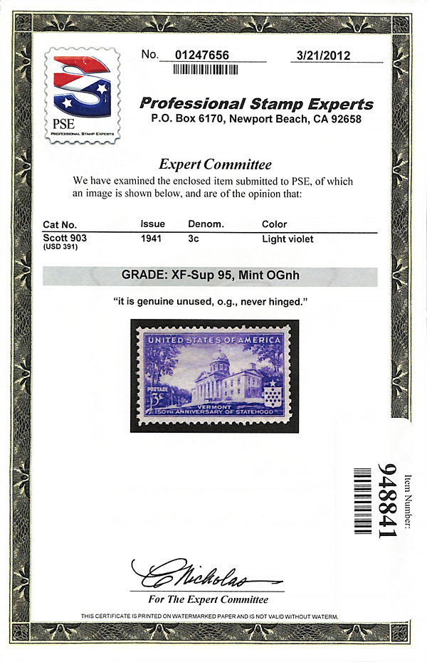 7155 nh 903 image1941, 3¢ Vermont Statehood (Scott 903), o.g., never hinged, Extremely Fine to Superb, with 2012 P.S.E. certificate graded XF-SUP 95.