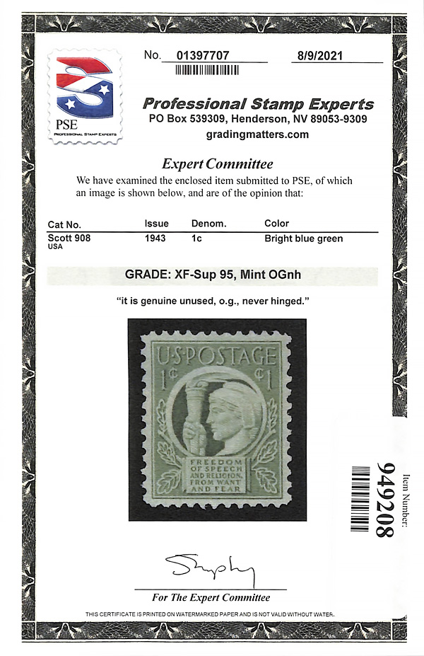 7157 nh 908 image1943, 1¢ Four Freedoms (Scott 908), o.g., never hinged, Extremely Fine to Superb, with 2021 P.S.E. certificate graded XF-SUP 95.