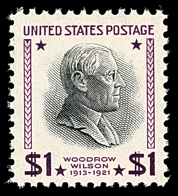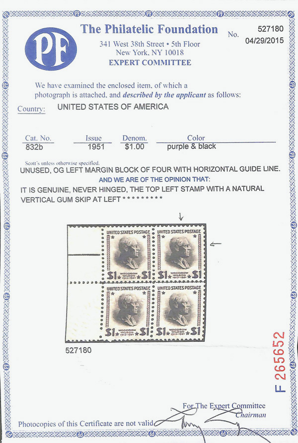 7151 nh 832b image1951, Presidential Issue, $1 Wilson, watermarked USIR (Scott 832b), o.g., never hinged, attractively centered with crisp color and detail, Very Fine, with photocopy of 2015 P.F. certificate for block of four, this position 2.
