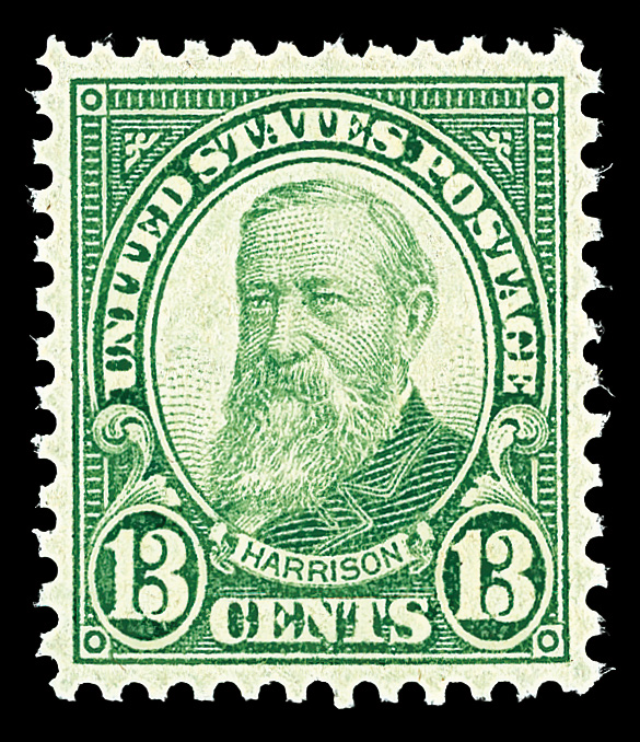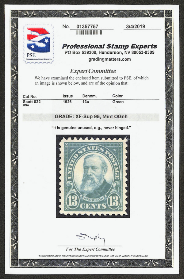 7128 nh 622 image1926, 13¢ Harrison (Scott 622), remarkably crisp freshness, o.g., never hinged, Extremely Fine to Superb, with 2019 P.S.E. certificate graded XF-SUP 95.