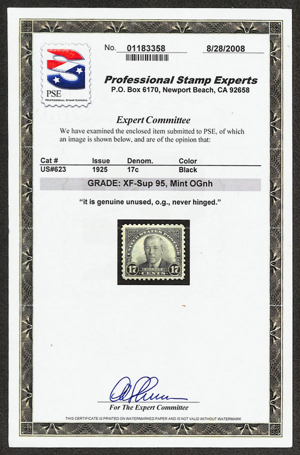 7129 nh 623 image1925, 17¢ Wilson (Scott 623), monumentally wide margins, o.g., never hinged, Extremely Fine to Superb, with 2008 P.S.E. certificate graded XF-SUP 95.