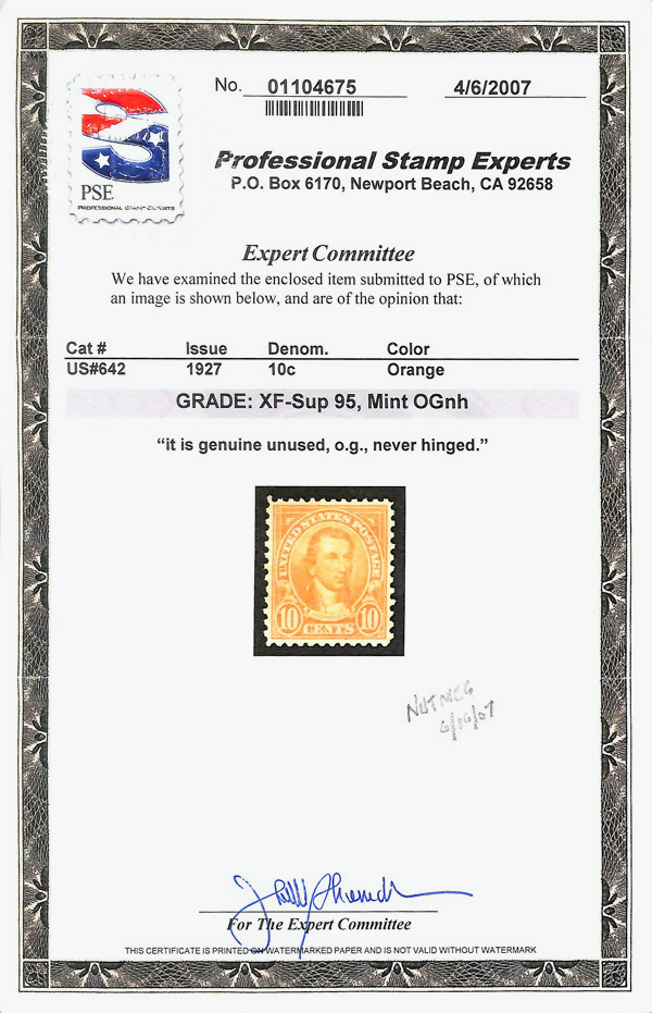 7135 nh 642 image1927, 10¢ Monroe, rotary press printing (Scott 642), first-rate freshness, o.g., never hinged, Extremely Fine to Superb, with 2007 P.S.E. certificate graded XF-SUP 95.
