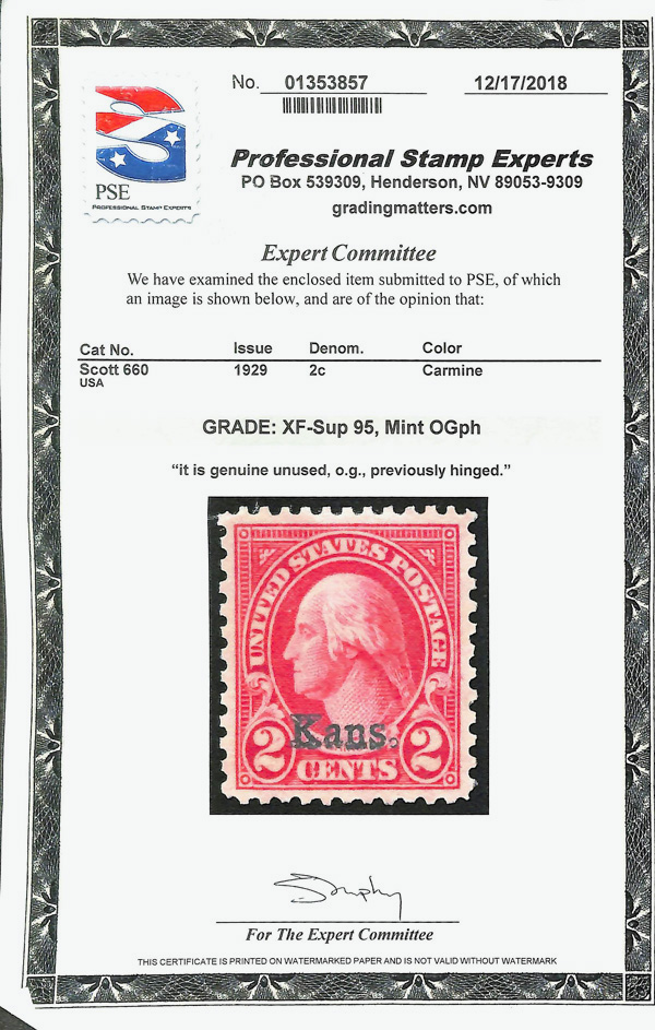 7139 og 660 image1929, 2¢ Kans. (Scott 660), bold saturated color, enormous full margins, o.g., previously hinged, Extremely Fine to Superb, with 2018 P.S.E. certificate graded XF-SUP 95.
