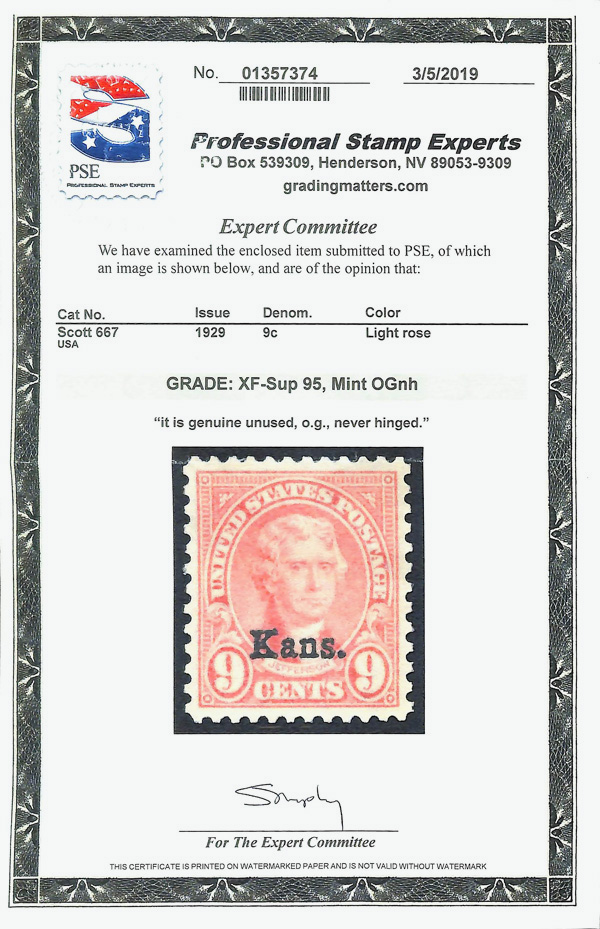7140 nh 667 image1929, 9¢ Kans. (Scott 667), clean strike, crisp borders, o.g., never hinged, Extremely Fine to Superb, with 2019 P.S.E. certificate graded XF-SUP 95.