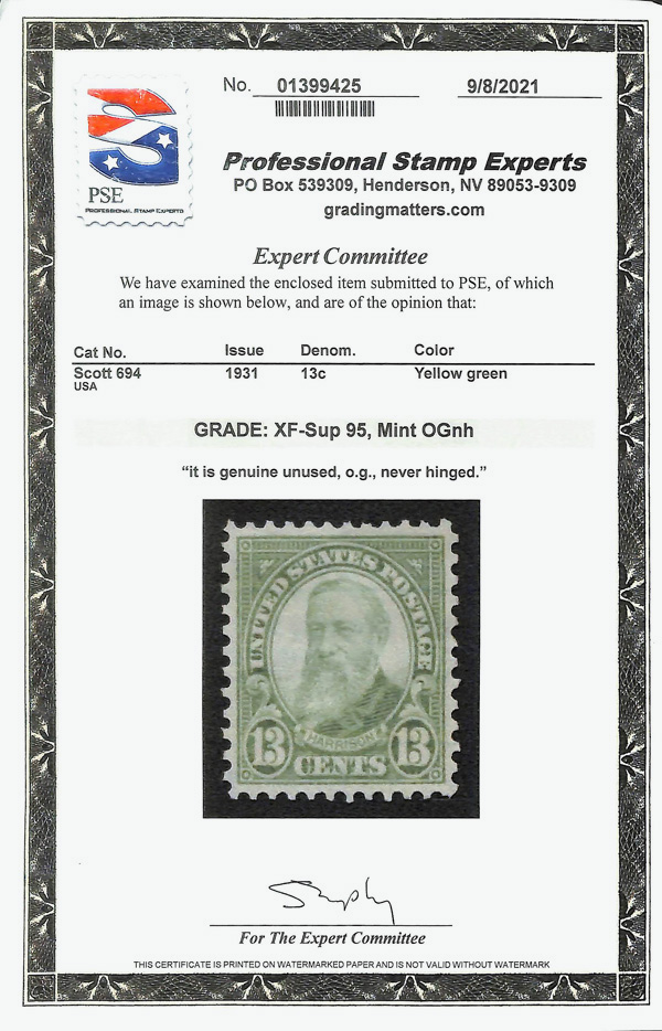 7143 nh 694 image1931, 13¢ Harrison, rotary press printing (Scott 694), remarkable overall look, large margins, o.g., never hinged, Extremely Fine to Superb, with 2021 P.S.E. certificate graded XF-SUP 95.