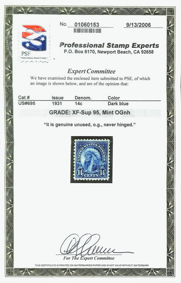 7144 nh 695 image1931, 14¢ American Indian, rotary press printing (Scott 695), untouched freshness, large margins, o.g., never hinged, Extremely Fine to Superb, with 2006 P.S.E. certificate graded XF-SUP 95.