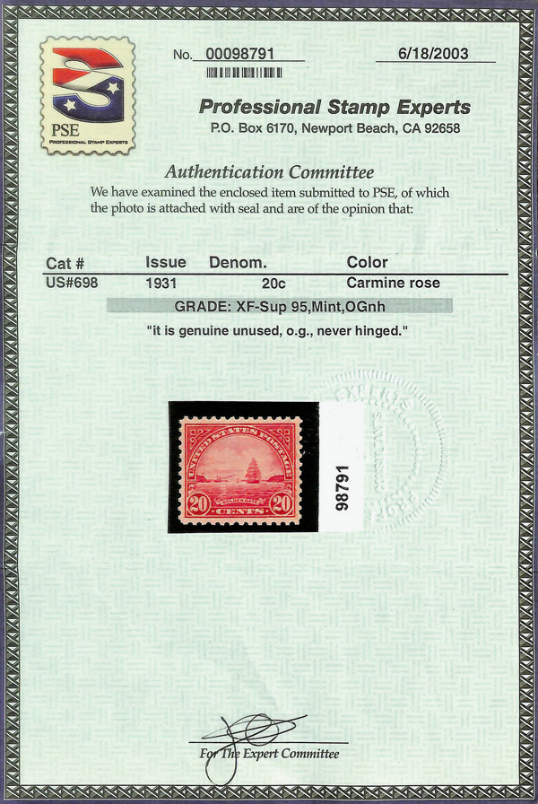 7145 nh 698 image1931, 20¢ Golden Gate, rotary press printing (Scott 698), radiant vibrant shade, visually striking, o.g., never hinged, Extremely Fine to Superb, with 2003 P.S.E. certificate graded XF-SUP 95.