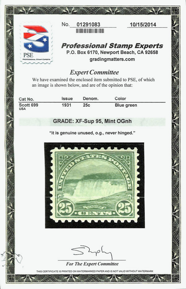 7146 nh 699 image1931, 25¢ Niagara Falls, rotary press printing (Scott 699), jewel-like hue, mathematically centered, o.g., never hinged, Extremely Fine to Superb, with 2014 P.S.E. certificate graded XF-SUP 95.