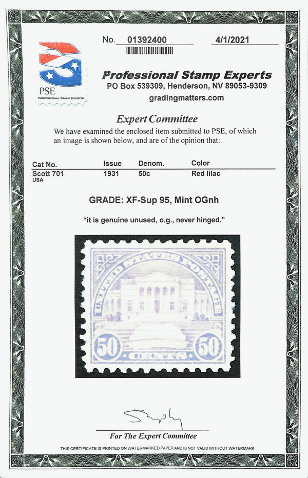 7147 nh 701 image1931, 50¢ Arlington Amphitheater, rotary press printing (Scott 701), crisp appearance, well-balanced margins, o.g., never hinged, Extremely Fine to Superb, with 2021 P.S.E. certificate graded XF-SUP 95.