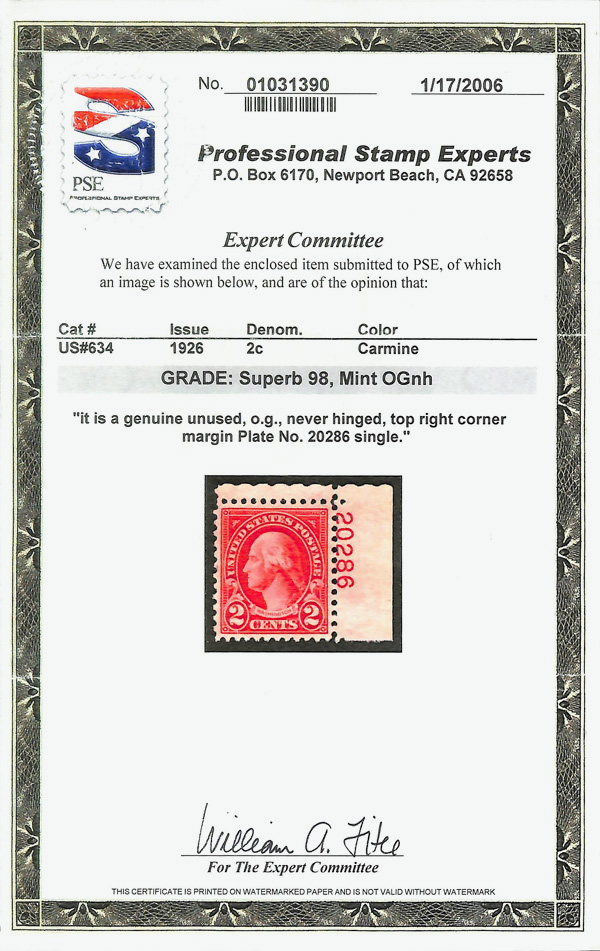 7131 nh 634 image1926, 2¢ Washington, type I, rotary press printing (Scott 634), single with plate number, precise margins and tone, o.g., never hinged, Superb, with 2006 P.S.E. certificate graded SUP 98.