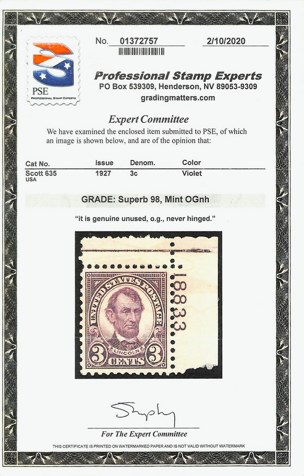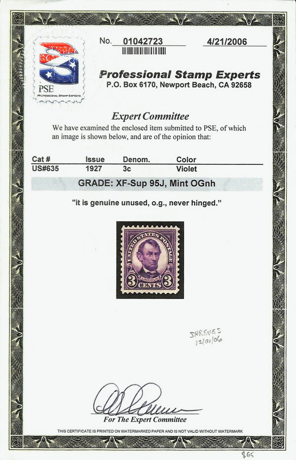 7132 nh 635 image1927, 3¢ Lincoln, rotary press printing (Scott 635), full margins, bright tone, o.g., never hinged, Extremely Fine to Superb, with 2006 P.S.E. certificate graded XF-SUP 95J.