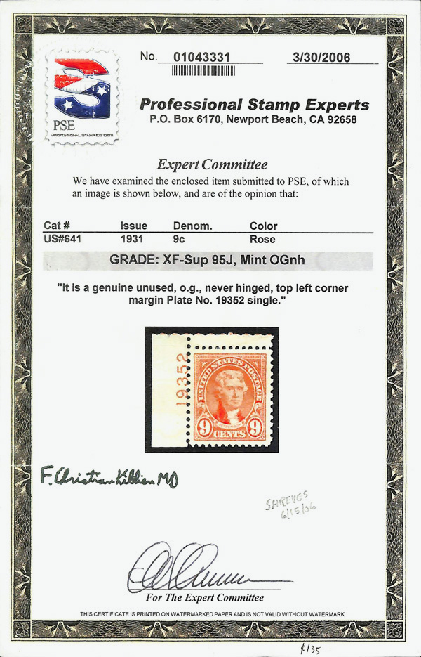 7134 nh 641 image1931, 9¢ Jefferson, rotary press printing (Scott 641), single with plate number, cleanly printed and centered, o.g., never hinged, Extremely Fine to Superb, with 2006 P.S.E. certificate graded XF-SUP 95J.