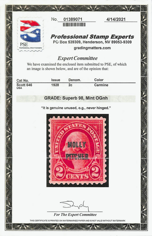 7136 nh 646 image1928, 2¢ Molly Pitcher (Scott 646), full margins with depth, o.g., never hinged, Superb, with 2021 P.S.E. certificate graded SUP 98.