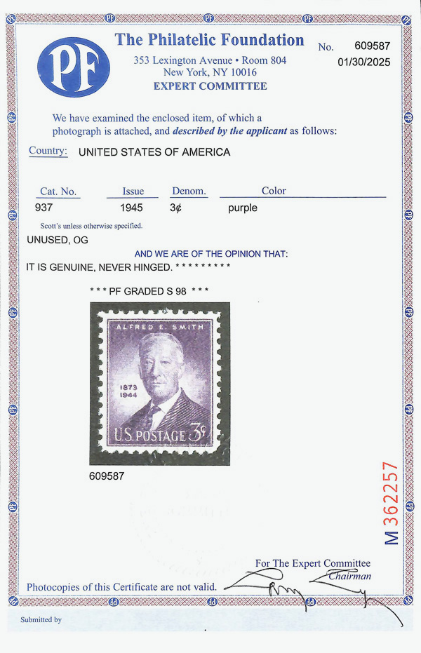 7158 nh 937 image1945, 3¢ Alfred E. Smith (Scott 937), o.g., never hinged, Superb, with 2025 P.F. certificate graded SUP 98.