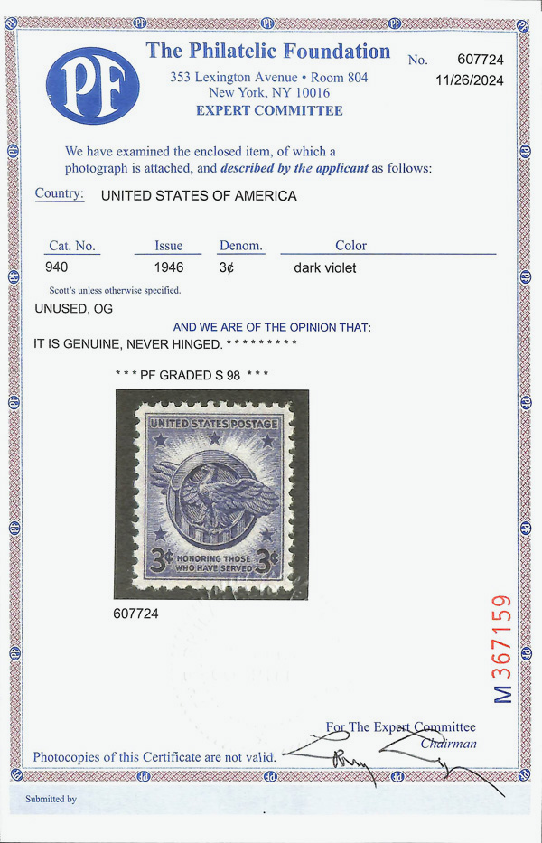 7159 nh 940 image1946, 3¢ Veterans of World War II (Scott 940), o.g., never hinged, Superb, with 2024 P.F. certificate graded SUP 98.