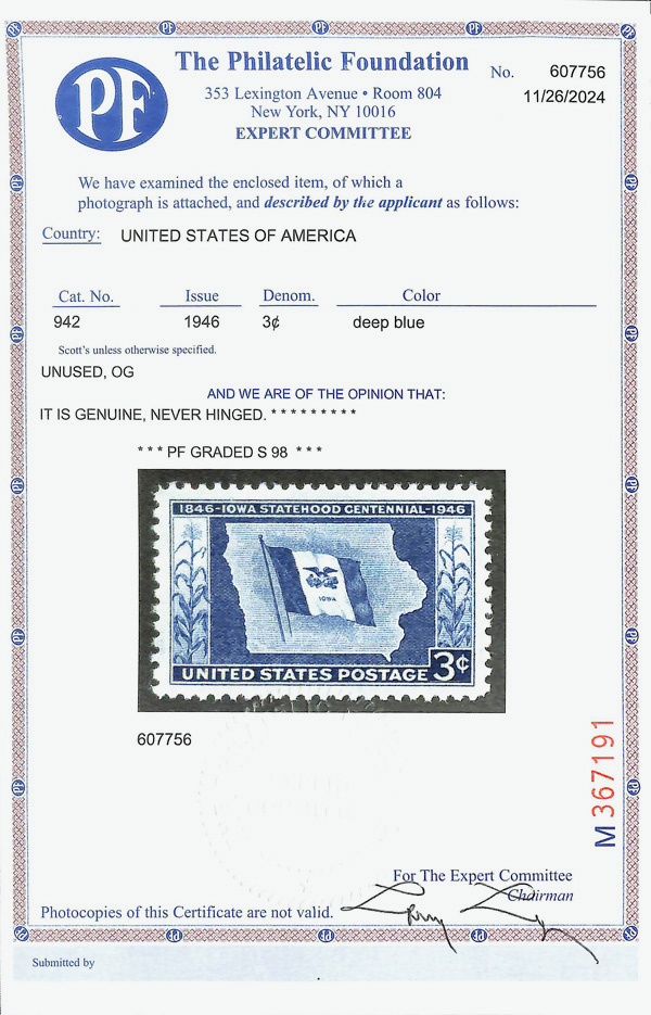 7160 nh 942 image1946, 3¢ Iowa Statehood (Scott 942), o.g., never hinged, Superb, with 2024 P.F. certificate graded SUP 98.
