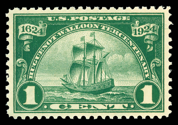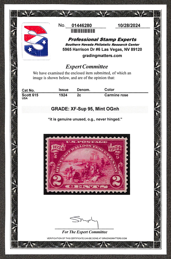 7125 nh 615 image1924, 2¢ Huguenot-Walloon (Scott 615), Radiates brilliant hue, o.g., never hinged, Extremely Fine to Superb, with 2024 P.S.E. certificate graded XF-SUP 95.
