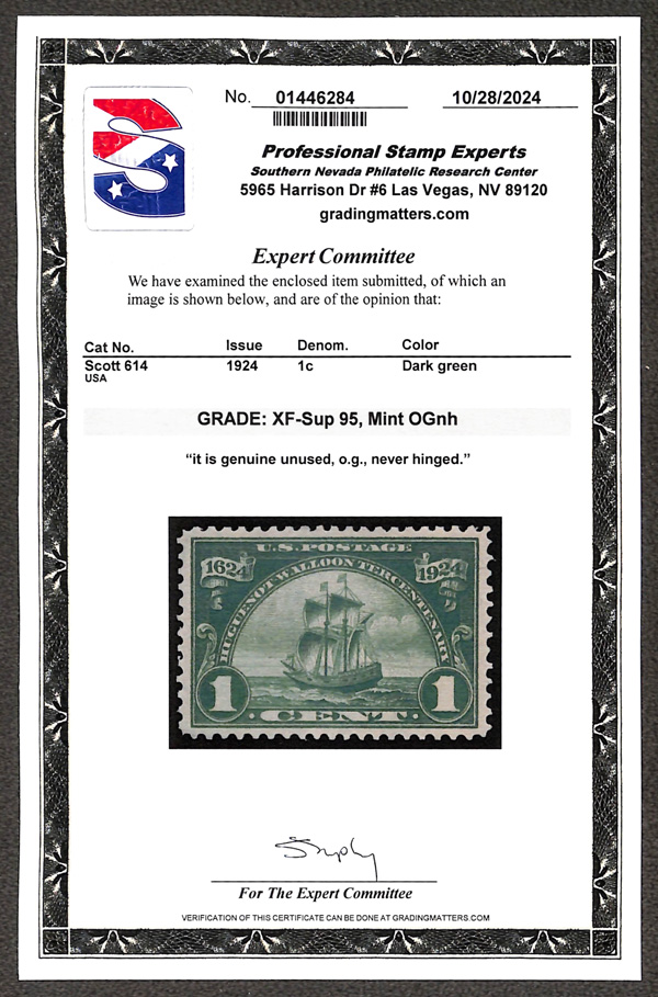 7124 nh 614 image1924, 1¢ Huguenot-Walloon (Scott 614), Distinct and bold features, o.g., never hinged, Extremely Fine to Superb, with 2024 P.S.E. certificate graded XF-SUP 95.