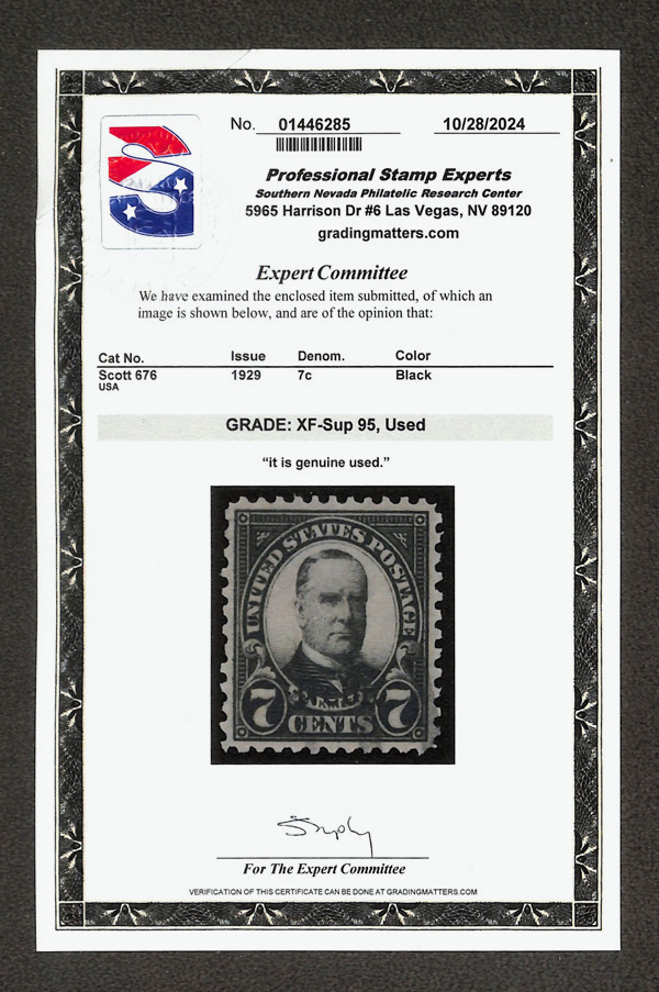 7141 O 676 image1929, 7¢ Nebr. (Scott 676), Nicely equal margins, Extremely Fine to Superb, with 2024 P.S.E. certificate graded XF-SUP 95.