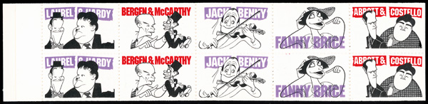 7244 BKnh 2566c image1991, 29¢ Comedians, booklet pane of 10, scarlet & bright violet (engraved) omitted (Scott 2566c), top pane of complete unexploded booklet, the second pane normal, o.g., never hinged, Post Office fresh, Very Fine.