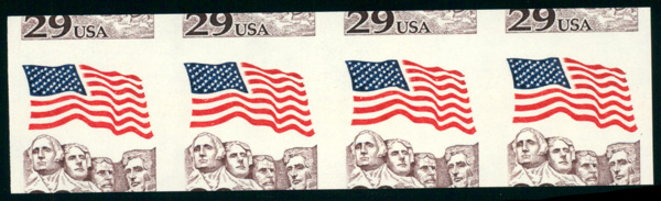 7243 nh 2523b image1991, 29¢ Flag over Mt. Rushmore, engraved coil, imperf. pair (Scott 2523b), miscut, o.g., never hinged, Very Fine to Extremely Fine.