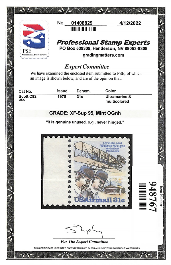 7259 nh C92 imageAirmail, 1978, 31¢ Wright Brothers (Scott C92), o.g., never hinged, Extremely Fine to Superb, with 2022 P.S.E. certificate graded XF-SUP 95.