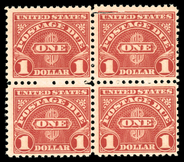 7271 nhbl J77a imagePostage Due, 1930, $1 scarlet (Scott J77a), block of 4, o.g., never hinged (2 stamps with gum skip); 1 stamp with long tear at top, Fine to Very Fine.