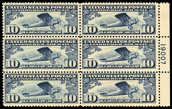 7253 nhbl C10 imageAirmail, 1927, 10¢ Lindbergh (Scott C10), right margin plate number 19007 block of 6, o.g., never hinged, sound with crisp detail and deep, clean color, Fine to Very Fine.