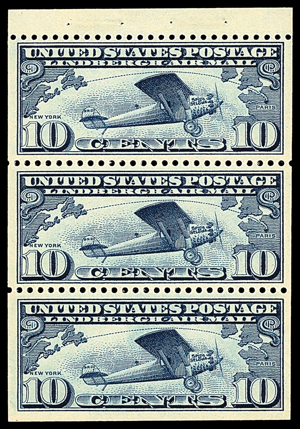 7254 BKnh C10a imageAirmail, 1928, 10¢ Lindbergh, booklet pane of 3 (Scott C10a), o.g., never hinged, with selvage tab, sound with solid perforations and sharp, clean impression; normal diagonal gum bend noted for accuracy, Very Fine.