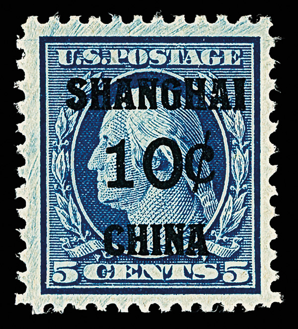 7275 nh K5 imageOffices in China, 1919, 10¢ on 5¢ blue (Scott K5), o.g., never hinged, a lovely example with bold color and sharp detail, fresh with margins bordering on jumbo, Very Fine.
