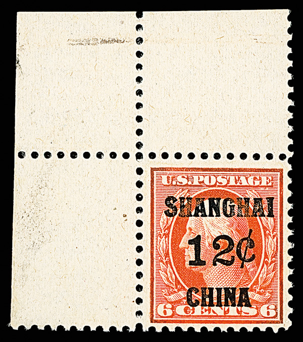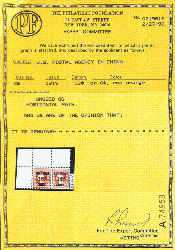 7276 nh K6 imageOffices in China, 1919, 12¢ on 6¢ red orange (Scott K6), top left corner margin single, o.g., never hinged, a grand positional, fresh with radiant color and massive selvage, Very Fine, with 1990 P.F. certificate for pair, this position 1.