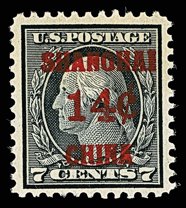 7277 nh K7 imageOffices in China, 1919, 14¢ on 7¢ black (Scott K7), o.g., never hinged, eye-catching with strong color and proof-like detail, nicely centered on pristine paper, Very Fine.