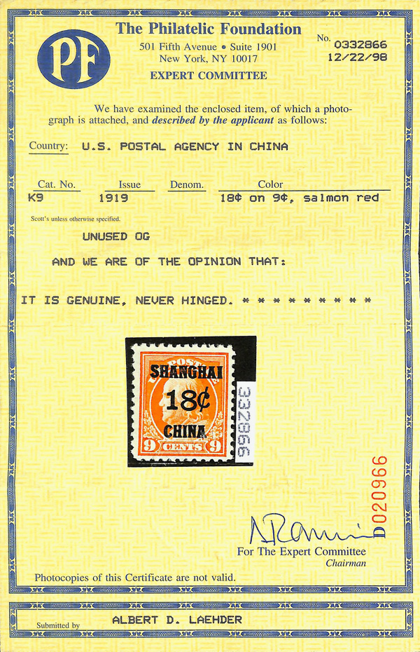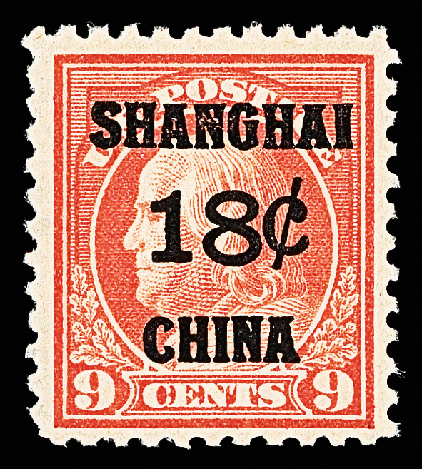 7279 nh K9 imageOffices in China, 1919, 18¢ on 9¢ salmon red (Scott K9), o.g., never hinged, sound with vibrant color on glowing white paper, Fine to Very Fine, with 1998 P.F. certificate.