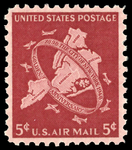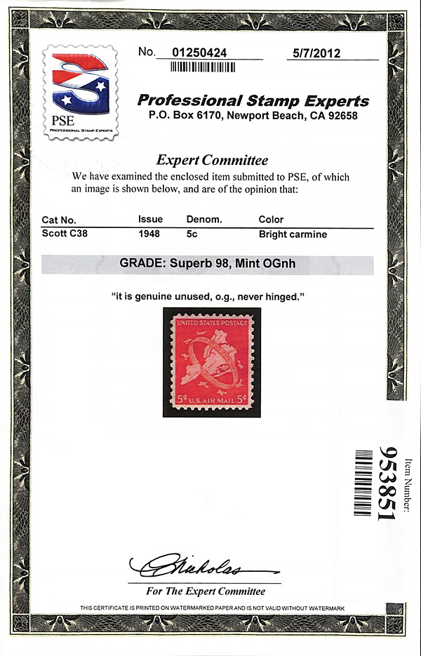 7257 nh C38 imageAirmail, 1948, 5¢ New York City (Scott C38), o.g., never hinged, Superb, with 2012 P.S.E. certificate graded SUP 98.