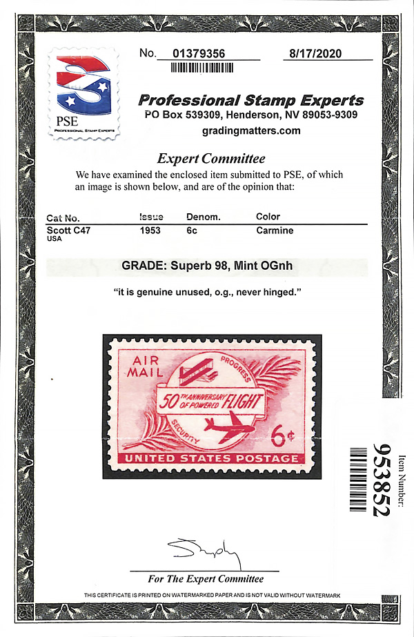 7258 nh C47 imageAirmail, 1953, 6¢ Powered Flight (Scott C47), o.g., never hinged, Superb, with 2020 P.S.E. certificate graded SUP 98.