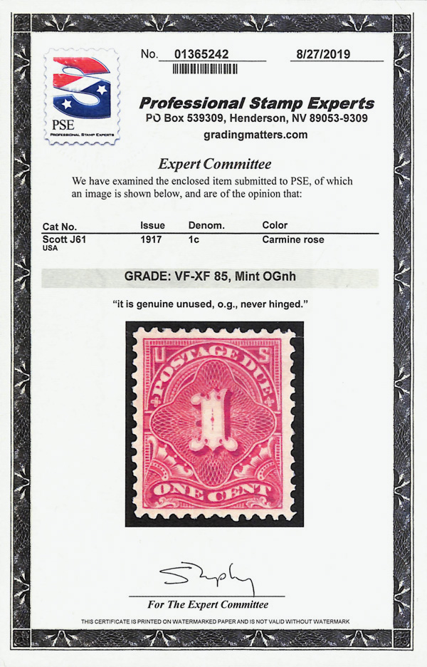 7270 nh J61 imagePostage Due, 1917, 1¢ carmine rose, unwatermarked, perf. 11 (Scott J61), o.g., never hinged, sound and Post Office fresh with crisp detail, Very Fine to Extremely Fine, with 2019 P.S.E. certificate graded VF-XF 85.