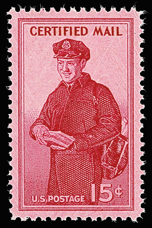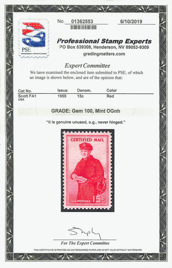 7267 nh FA1 imageCertified Mail, 1955, 15¢ red (Scott FA1), vibrant tone and fresh, o.g., never hinged, with 2019 P.S.E. certificate graded GEM 100.