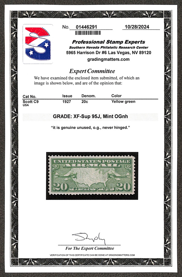 7252 nh C9 imageAirmail, 1927, 20¢ Map & Planes (Scott C9), Wonderfully preserved freshness, o.g., never hinged, Extremely Fine to Superb, with 2024 P.S.E. certificate graded XF-SUP 95J.