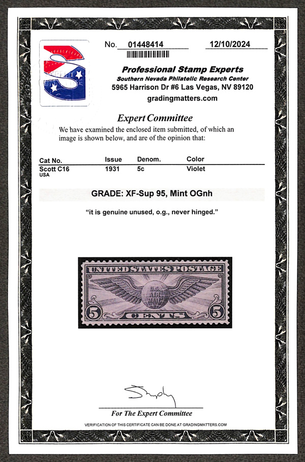 7255 nh C16 imageAirmail, 1931, 5¢ Winged Globe, rotary press printing (Scott C16), Wonderfully even positioning, o.g., never hinged, Extremely Fine to Superb, with 2024 P.S.E. certificate graded XF-SUP 95.